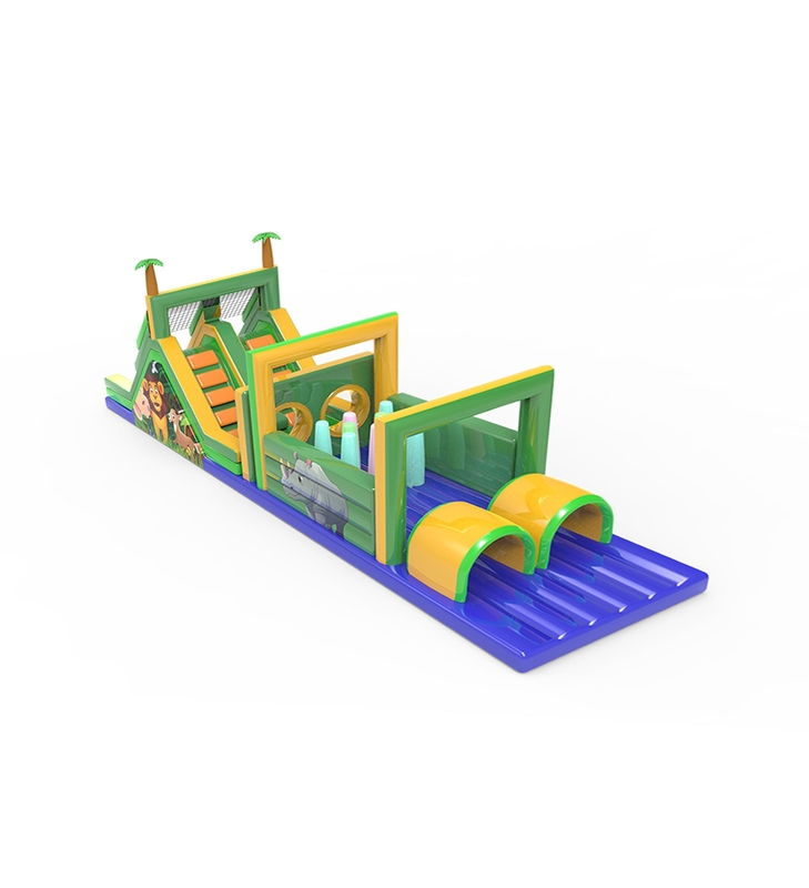 Αυτή η ζωντανή φουσκωτή πορεία εμποδίων διαθέτει ένα παιχνιδιάρικο θέμα ζούγκλας με διακοσμήσεις ζώων όπως λιοντάρια και ρινόκερους. Σχεδιασμένο για τη φυσική πρόκληση και τη διασκέδαση των παιδιών, περιλαμβάνει ράμπες αναρρίχησης, σήραγγες και διάφορα εμπόδια σε ένα ασφαλές, συναρπαστικό περιβάλλον.